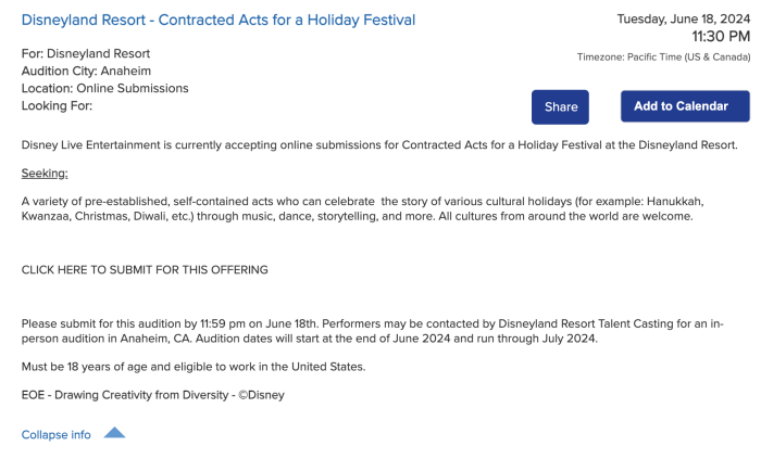The Disney Auditions website recently posted a casting call for a “Holiday Festival” at Disneyland Resort. The posting says they’re seeking the following: “A variety of pre-established, self-contained acts who can celebrate the story of various cultural holidays (for example: Hanukkah, Kwanzaa, Christmas, Diwali, etc.) through music, dance, storytelling, and more. All cultures from around the world are welcome.”