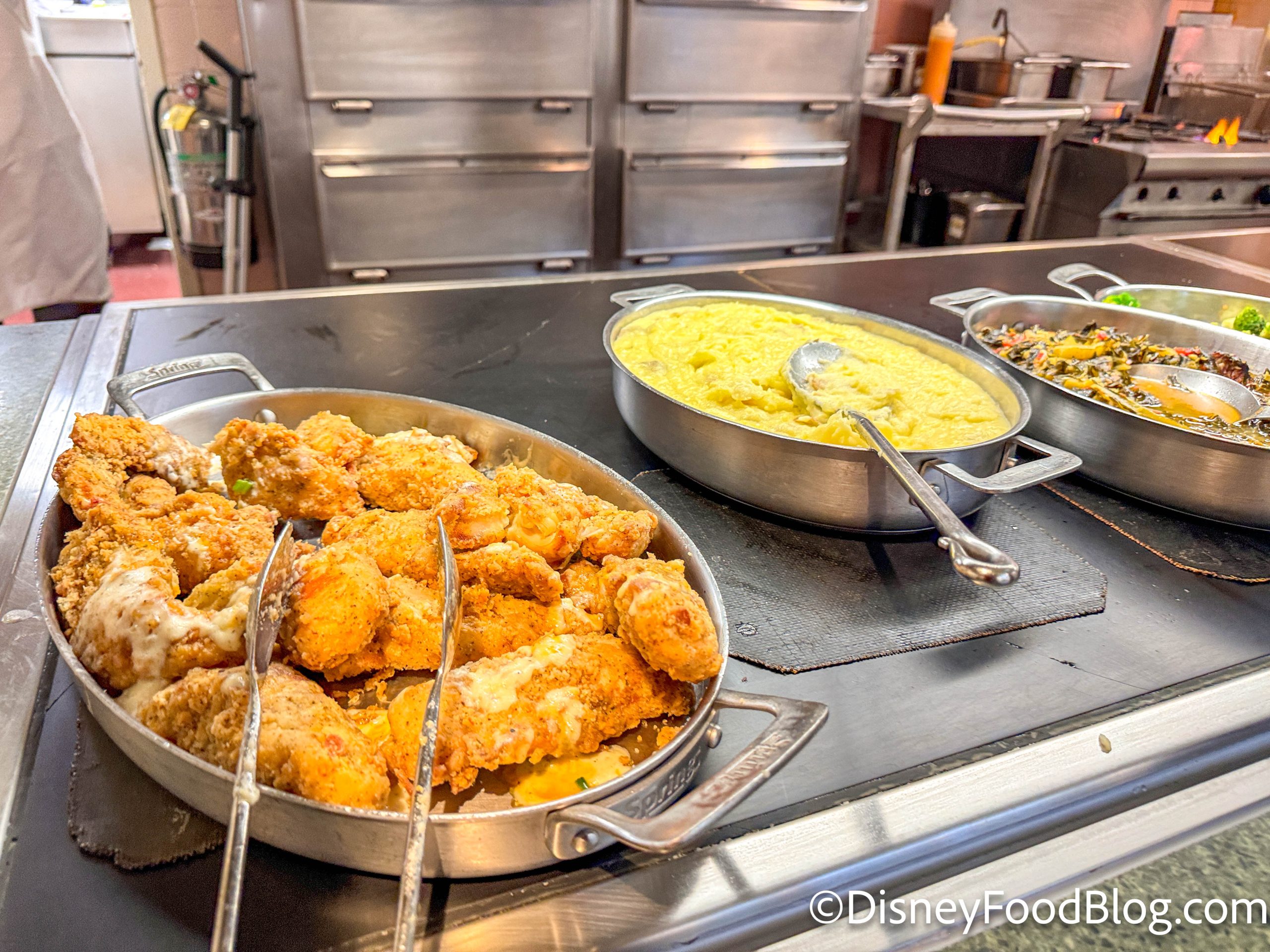On the main buffet, we’ve got Country Fried Chicken, mashed potatoes, and collard greens.