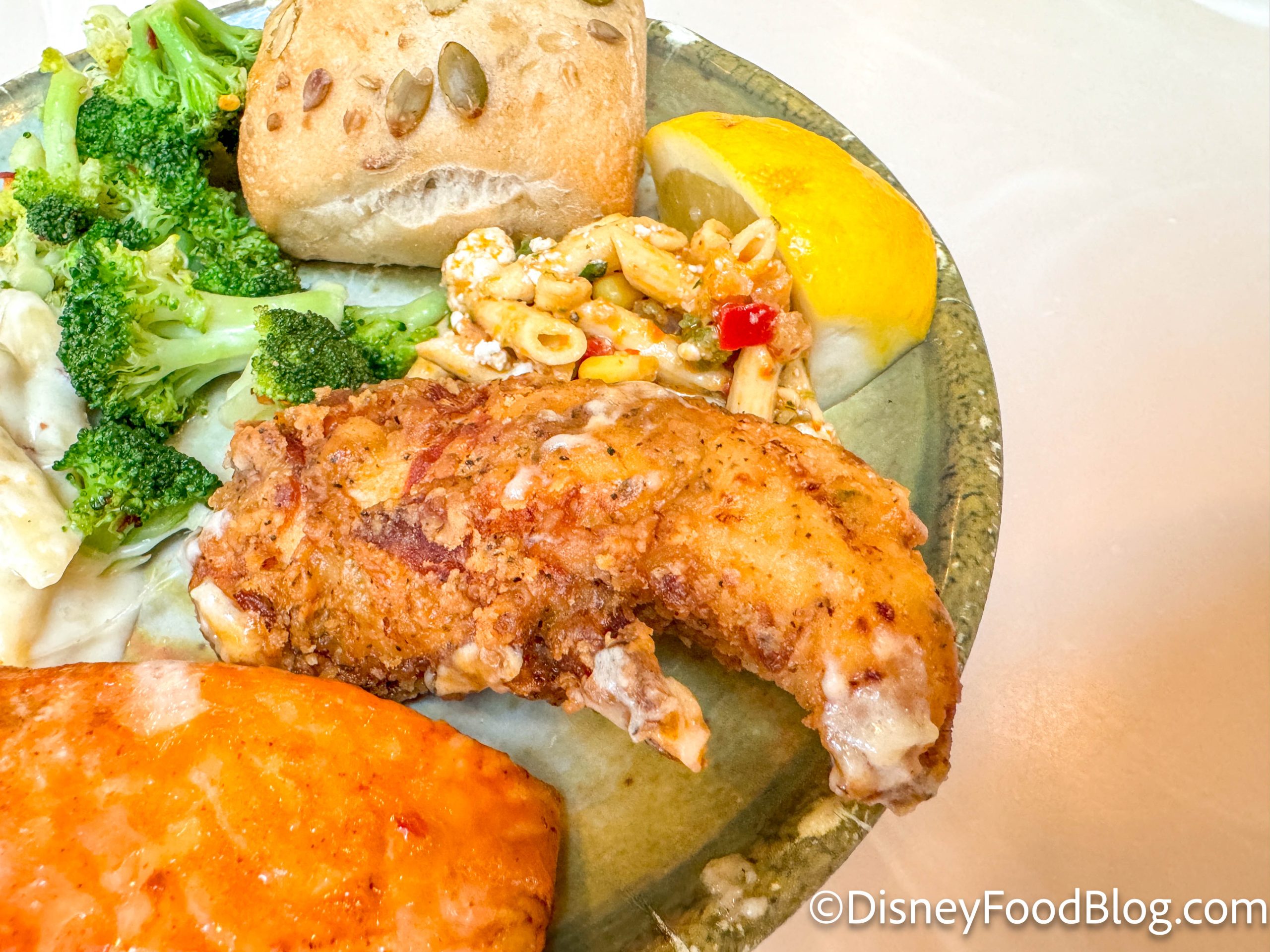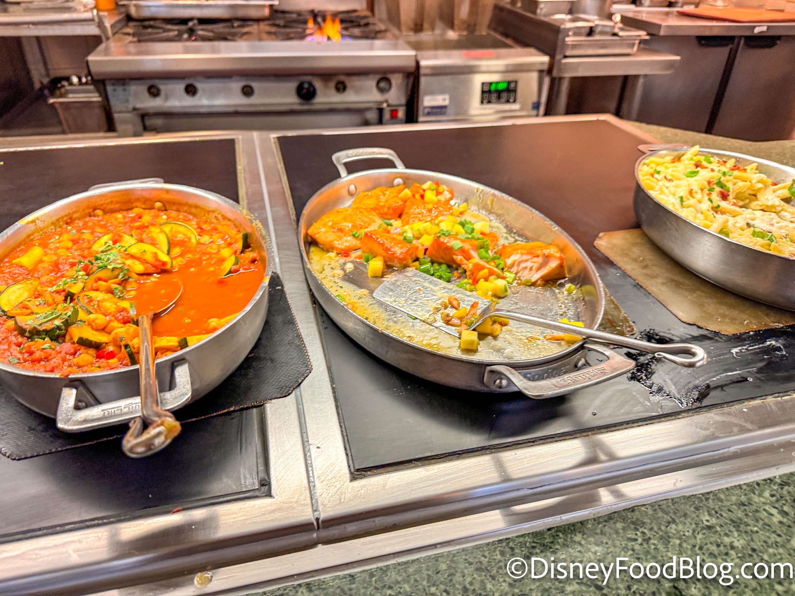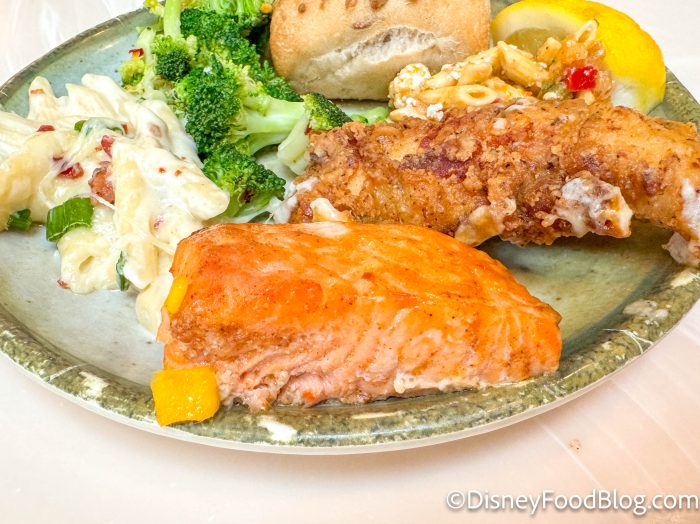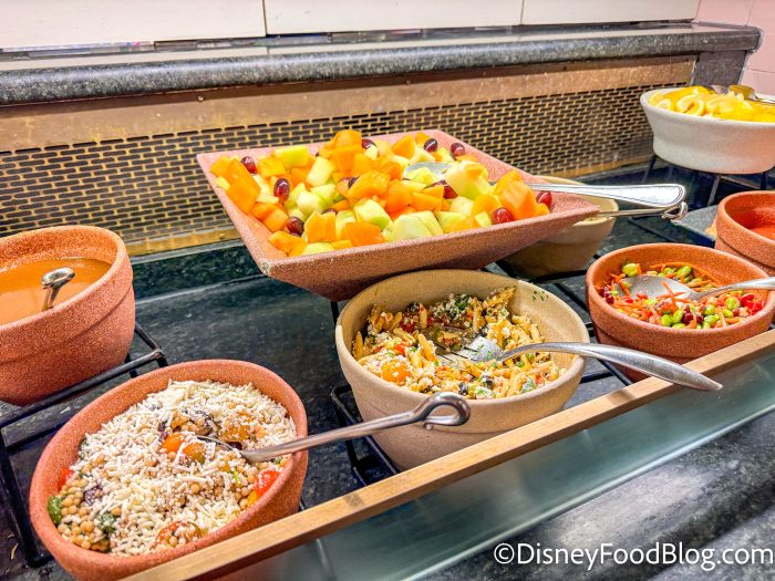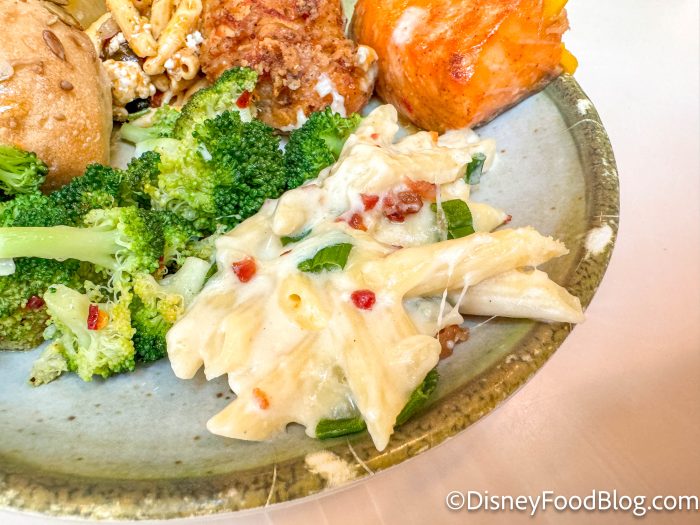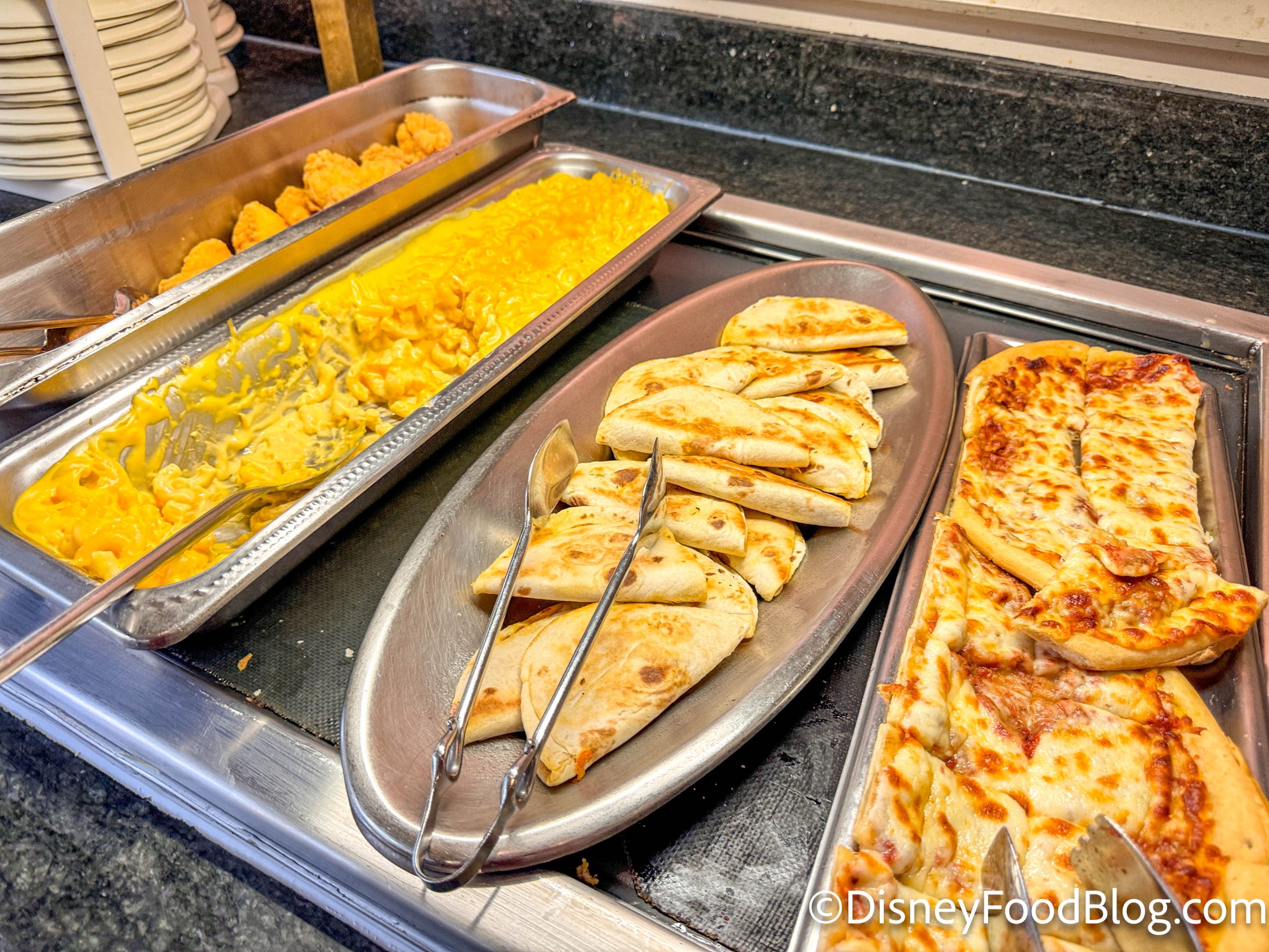 When things swapped over for lunchtime, Disney rolled out an entirely new buffet! Starting things off with the kids’ section, we’ve got chicken tenders, mac and cheese, mini beef quesadillas, and cheesy pizza bread.