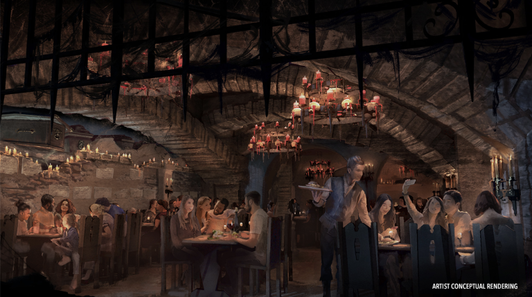 First up, Universal announced the new Das Stakehaus, a quick-service restaurant within Dark Universe that is themed around an “old inn and dining hall built over the ruins of ancient catacombs.” The name is not only a play on the Eastern European setting of vampire lore, but a literal play on words — “stake” instead of “steak” as it relates to vampires is a funny double entendre!