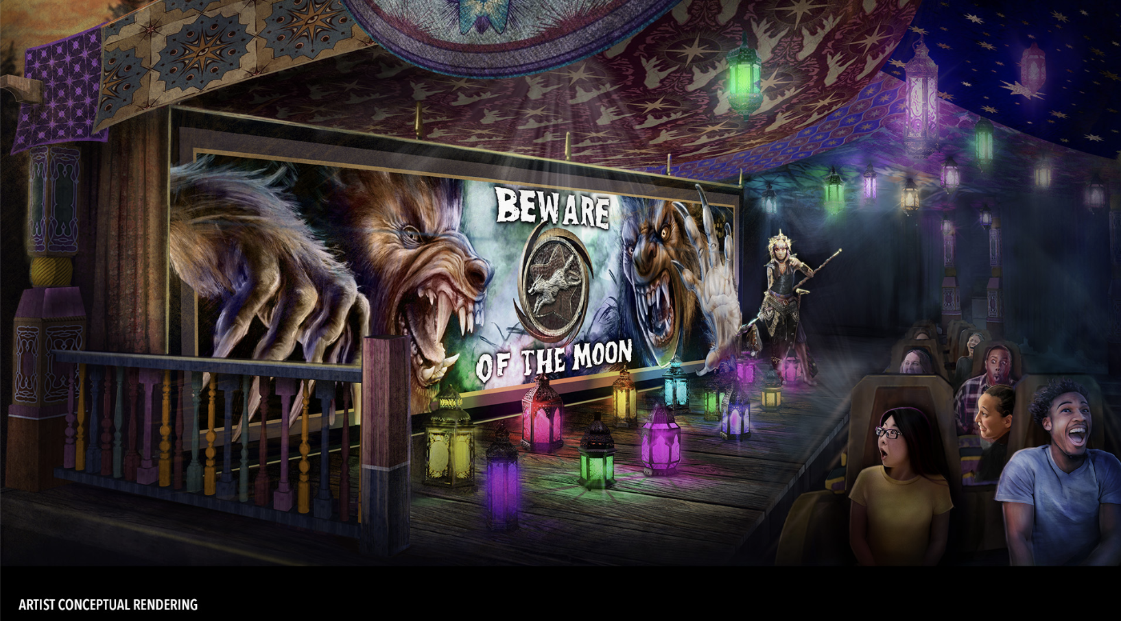 According to the official synopsis of Curse of the Werewolf, guests will enter the Guild of Mystics and be “greeted by Maleva, the guild’s all-knowing seer and leader, who warns them that they bear the mark of the werewolf. Guests then board a wagon and venture into the forest, racing to escape the werewolves before they become one themselves.”