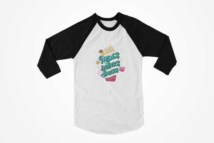Fun rides, yummy snacks, and delicious drinks: These are a few of our favorite things! Represent some of the most enjoyable things at the Disney parks with this Baseball Tee featuring a classic Dole Whip, a mad tea cup, fireworks, a pretzel, and the best theme park fries.