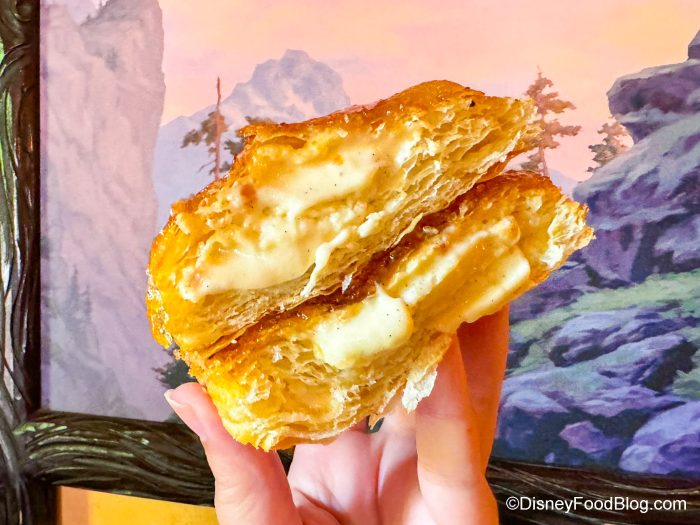 We also tried the Crème Brûlée Croissant. Yes, there’s another over-the-top croissant in Disney World. For $5.29, you get a crispy croissant dough filled with vanilla bean custard. First, get napkins because this baby is messy to eat. With that being said, the croissant dough isn’t quite as fluffy, but it’s still soft. The caramelization on top is sweet and sticky with a hint of char flavor. It adds a nice texture to the croissant as a whole.