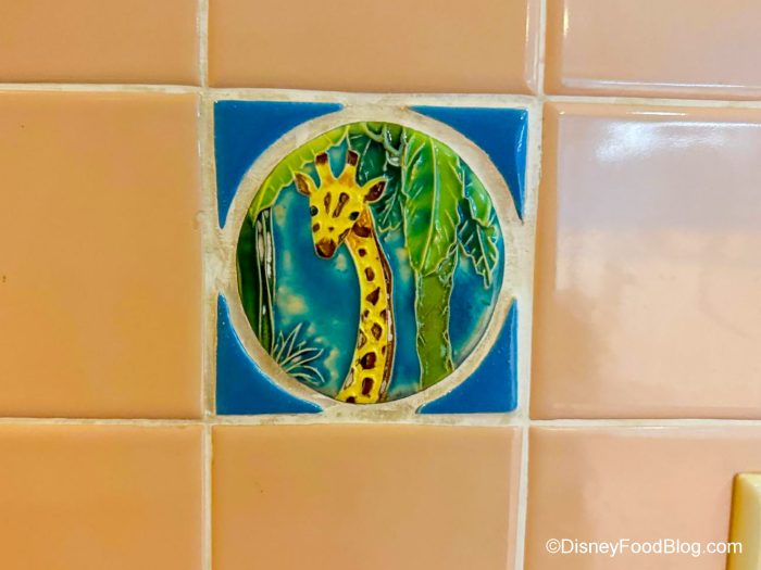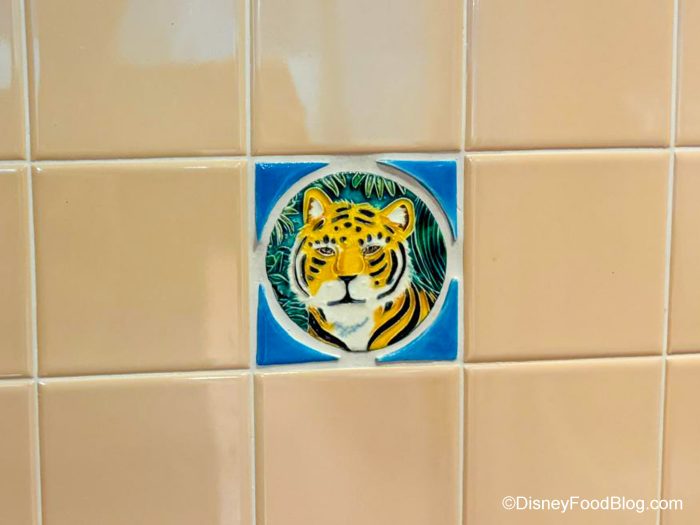 So let’s check out the bathrooms here! Once you find the bathrooms, you’ll find yourself in a quiet relaxing space with some beautiful tiles on the walls, with animals, like this tiger…