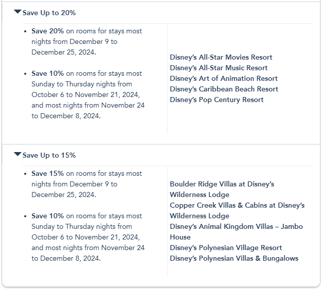 With this deal, you can save up to 30% on hotel rooms most nights from November 24th to December 25th, 2024. Only certain dates will allow you to take advantage of the highest discount, but there are lots of hotels and dates included in this deal! Additionally, you can save up to 20% on most Sunday to Thursday nights from October 6th to November 21st, 2024. These are some great times to take part in the holiday festivities including Halloween and Christmas.