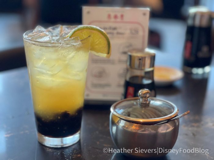 To drink, we tried the non-alcoholic Honey Lemonade with Boba. The drink without boba costs $7.50 and boba costs $1.50. The lemonade is made to order with crushed ice, freshly squeezed lemon juice, and a drizzle of honey. The boba consists of chewy tapioca pearls mixed with brown sugar and honey.