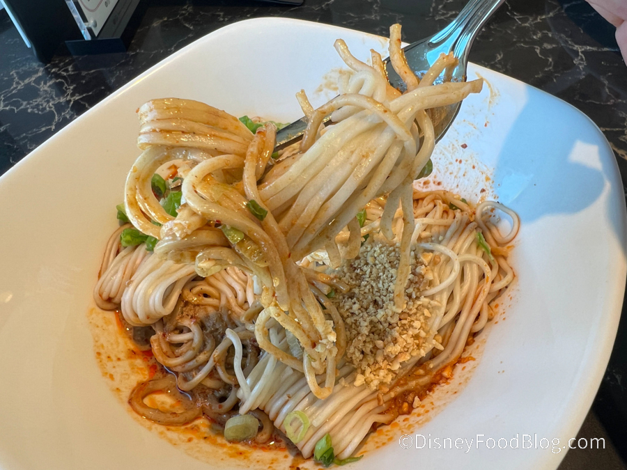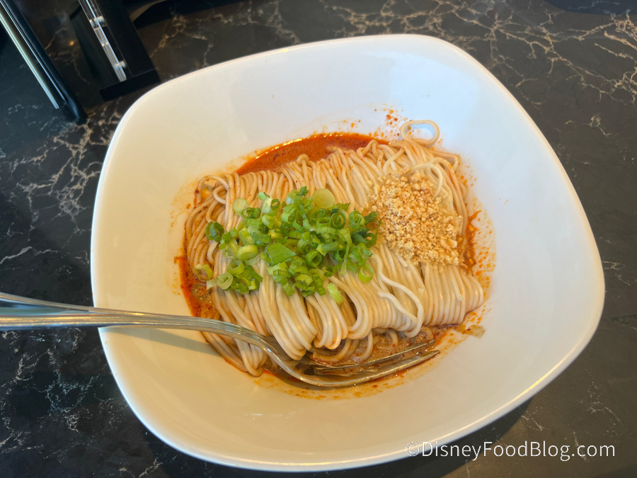 The Noodles in Sesame Sauce cost $13 and include house-made thin egg noodles coated in a nutty sesame sauce and topped with chili oil and crushed roasted peanuts.