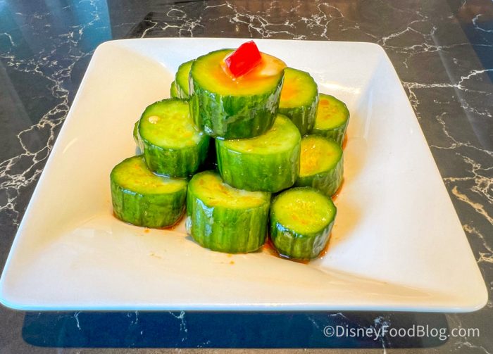 First up, we have the Cucumber Salad for $9. This appetizer is gluten-free and vegan and is made with crisp Persian cucumbers combined with cuts of mild Fresno chili peppers and sliced garlic all tossed together with sesame and Din Tai Fung chili oils.
