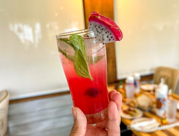 We washed that down with a Dragon Fruit Mojito made with Bacardi Light Rum, dragon fruit, prickly pear simple syrup, and fresh mint. We think this drink could be dangerous — we could hardly taste the rum. It was super fresh and summery, with really unique flavors thanks to the dragonfruit and prickly pear.