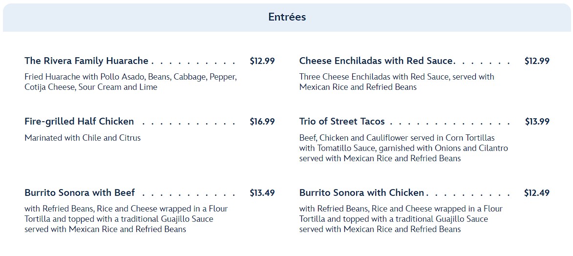 For our review, we tried the Cheese Enchiladas with Red Sauces, Trio of Street Tacos, Cucumber-mint Agua Fresca, and Cinnamon Crisps.