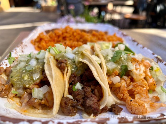 Up next is the Trio of Street Tacos for $13.99. These are served with beef, chicken, and cauliflower alongside Mexican rice and refried beans.