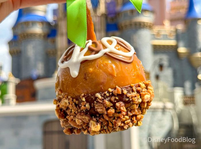 Next up, we grabbed the Pecan Praline Caramel Apple. This guy was really tasty! The chopped praline pecans added a great crunch and flavor, and they weren’t overly hard which was good so you could actually take a bite. The caramel was soft and had a lot of butter flavor, and that combined with the praline pecans was definitely the dominant flavor. The dark chocolate takes a back seat, but it was a nice addition that helped round out the flavors. It is hard to eat like most caramel apples, but very tasty! While it’s definitely more unique than a regular caramel apple, we’re not sure it would be a dessert we would rush to Magic Kingdom for.