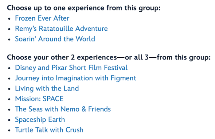 So for this example, at EPCOT, we’d pick Remy’s Ratatouille Adventure, Journey into Imagination with Figment, and Spaceship Earth.
