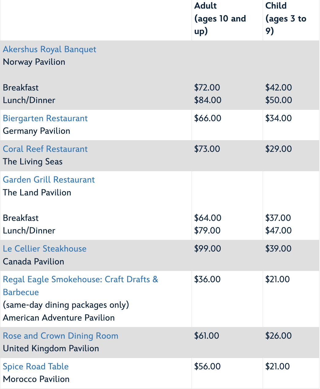 Here’s a look at the restaurants with dining packages and the pricing for each package: