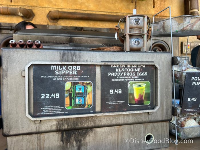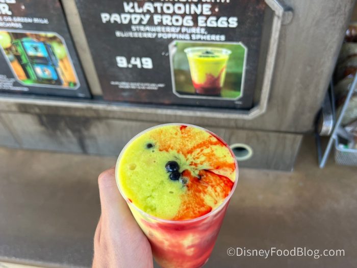 Right now, the Milk Stand in Galaxy’s Edge at Disneyland is selling a special Green Milk with Klatooine Paddy Frog Eggs and we tried it out!
