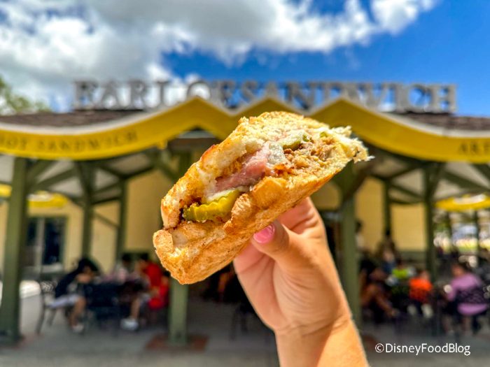 Next we are headed to Earl of Sandwich to try out the Datil Pepper Cuban Sandwich. This sandwich includes roasted carnitas, ham, Swiss cheese, sweet pickles, and datil pepper aïoli and costs $8.99.
