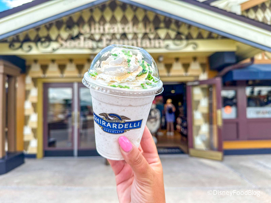 Next up, we are headed over to Ghirardelli Soda Fountain & Chocolate Shop to grab the Key Lime Pie Shake. This shake is vanilla ice cream blended with Key lime juice and graham cracker and topped with whipped cream, green sprinkles, and crushed graham crackers for $12.95.