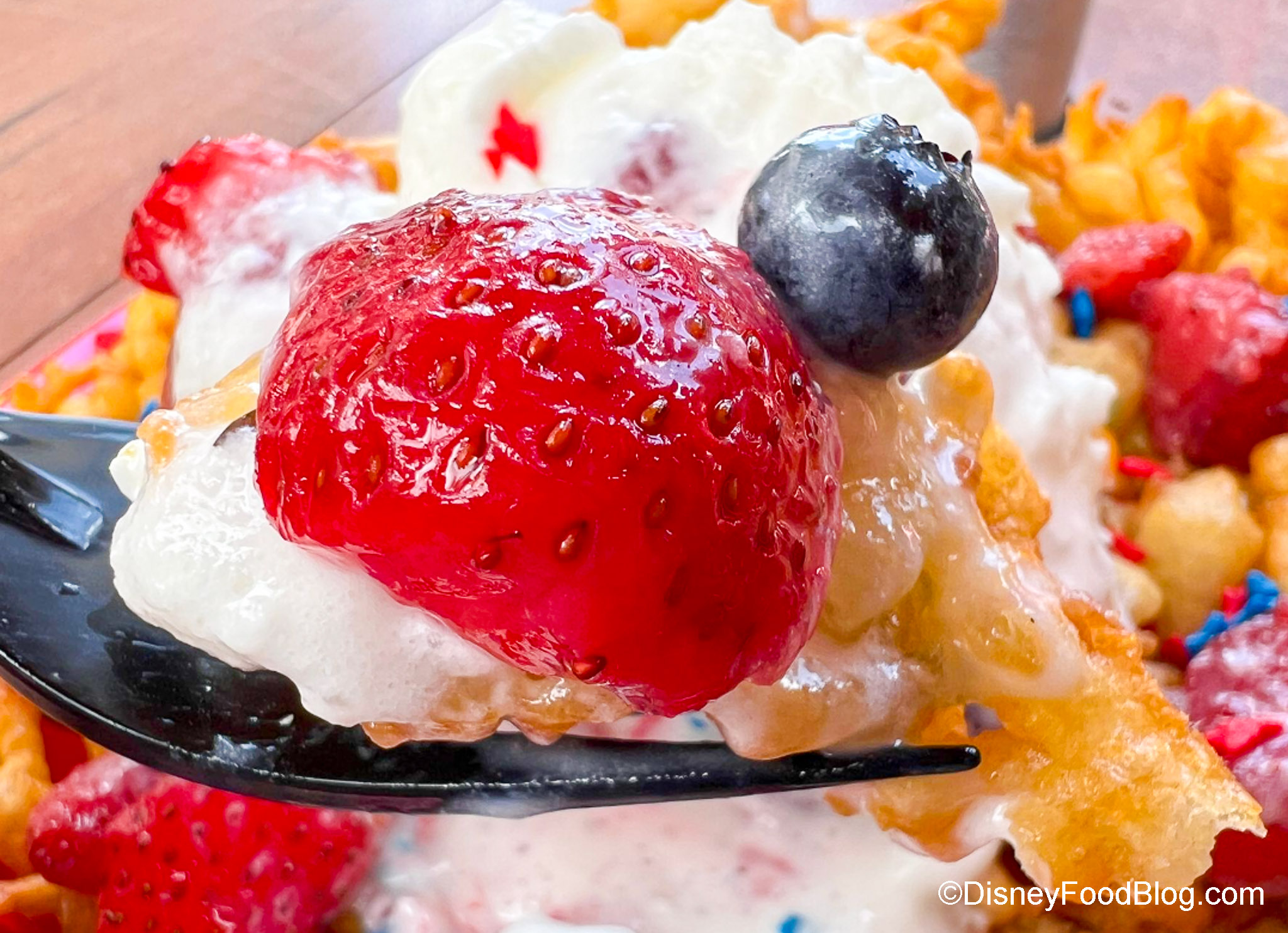 That means we’re seeing some red, white, and blue decor up in Magic Kingdom, and we’re getting ready to dive into some delicious 4th of July snacks that are well, red, white, and blue (you see where we’re going with this, right?). Well, Sleepy Hollow Refreshments in Liberty Square is appropriately serving up a red, white, and blue snack RIGHT NOW, so we’re checking it out.