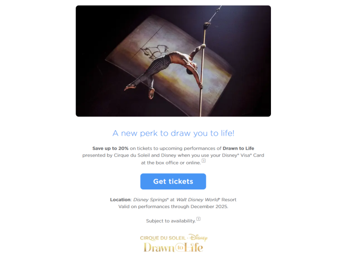Drawn to Life has been running at Disney Springs since 2021 and has remained a hit with audiences of all ages. And for those who want to watch the spectacle with their very eyes (or those who want to experience the magic once again), Disney is offering 20% off each ticket when you use your Disney® Visa® Card at the box office or online. This deal is limited to 8 tickets per Guest and is valid on performances through December 2025.