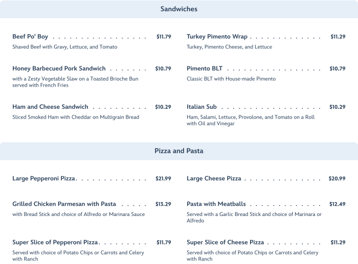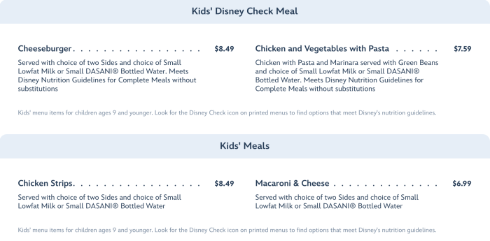 And we can’t forget about the kids! The menu for the little ones includes options like cheeseburgers, pasta, chicken strips, and macaroni and cheese.