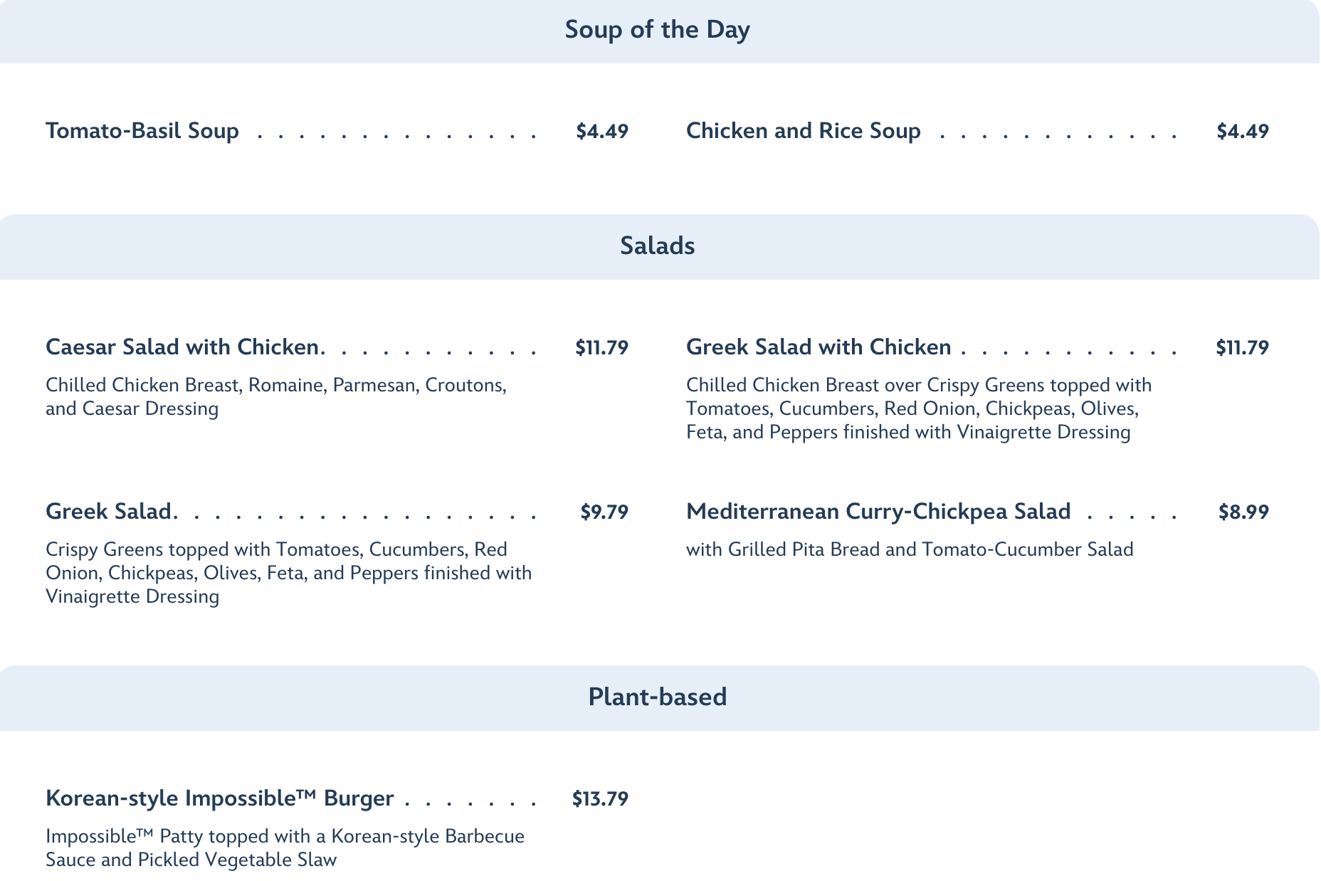 For lighter fare, you can grab a selection of soups or salads. And plant-based eaters may want to try the Korean-style Impossible Burger.