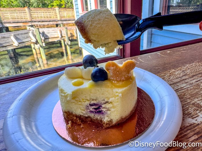 And finally, we’ve got dessert! I ordered the seasonal cheesecake option, which was a Blueberry Lemon Cheesecake for $6.29. It’s topped with a tiny Mickey-shaped sugar cookie!