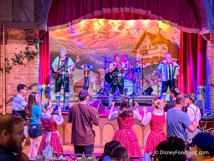 If you’re ready for an exciting, fun-filled meal, head over to Biergarten in EPCOT’s Germany for a spell! The Biergarten is a theater-style restaurant filled with long, family-style tables. It’s basically set up like an authentic German beer garden! The story (because every Disney experience has a story) is that this quaint Bavarian village is celebrating Oktoberfest, and you get to experience it! No matter when you eat here, for lunch or dinner, every experience is set on this Oktoberfest evening. Up on stage, German performers showcase authentic Oktoberfest numbers throughout the day — lederhosen and all!
