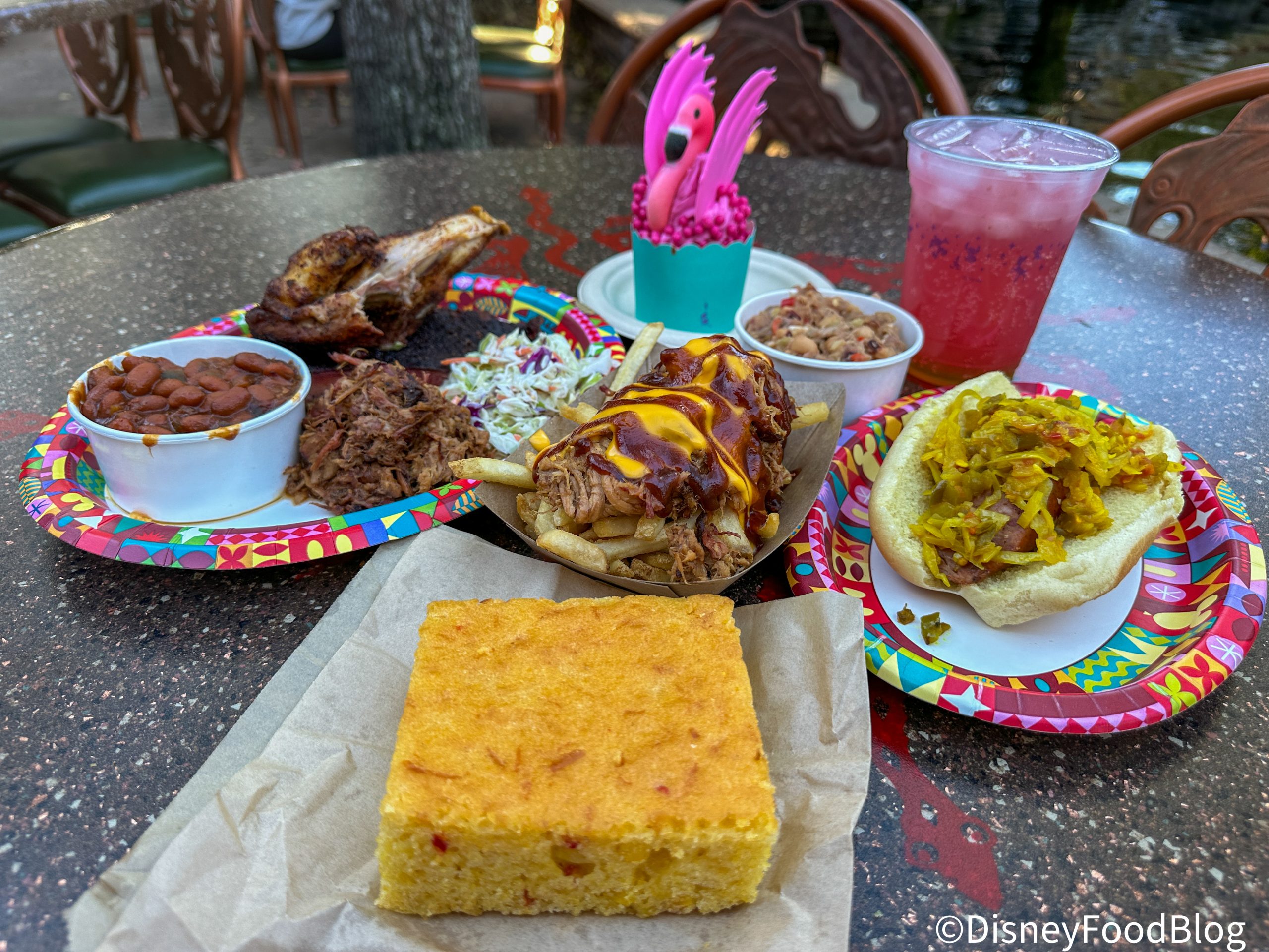 Flame Tree Barbecue is where guests with a beastly hunger can dine in a lush outdoor paradise overlooking Discovery River. Flame Tree Barbecue is a popular counter service spot in Disney’s Animal Kingdom featuring barbecue classics (along with a few twists)! There’s mac and cheese with pulled pork, ribs, chicken, and more.