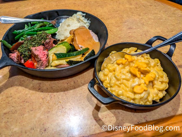The meal, served family-style, is both hearty and plentiful. Many guests like to refer to it as “Thanksgiving all year” thanks to the Patriot’s Platter, which serves up all-you-care-to-enjoy roasted turkey, pot roast, and oven-roasted pork served with mashed potatoes, mac and cheese, seasonal veggies, and herb stuffing. (A plant-based version of this meal and allergy-friendly options are also available.) Dessert is included as well, featuring the spot’s signature Ooey Gooey Toffee Cake… one of our favorite desserts in all of Disney World!