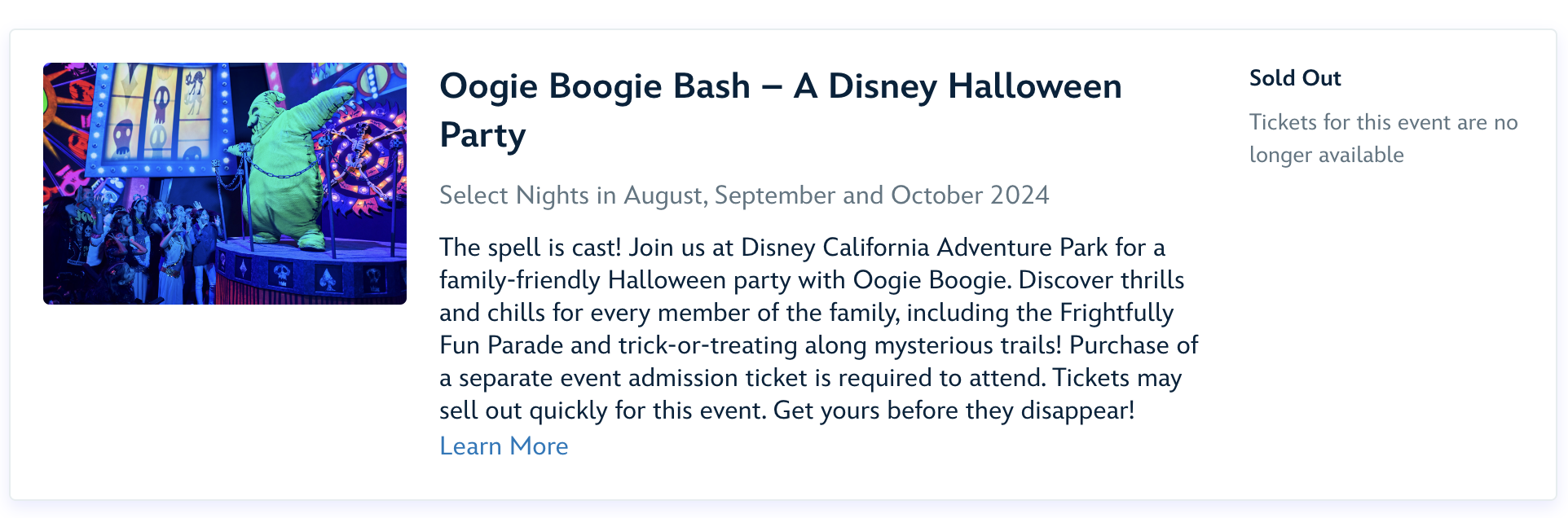 We saw tons of new updates released for the Halloween festivities that we will be able to find in both Disneyland and Disney World this year, and tickets have been on sale for the events on each coast for a few weeks now. If you were hoping to head to Oogie Boogie Bash in Disneyland this year, we hope you already got your tickets, because they’re SOLD OUT!