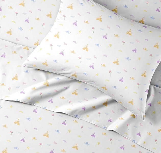 Adorned with roses, crowns, Cinderella’s carriage, and the silhouette of Cinderella Castle itself, these sheets can make any bedroom feel like a Disney hotel room.