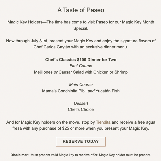 Additionally, Magic Key Passholders can stop by Tiendita, an on-the-go restaurant adjacent to Paseo. The quick-service restaurant is offering free agua fresca with any purchase of $25 or more. To receive both deals, Magic Keys must be presented and the Magic Key Passholder must be present.