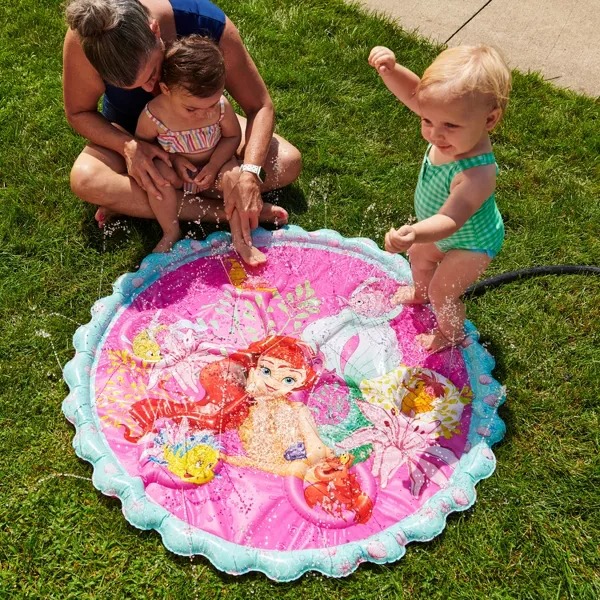 The splash mat is around 40 inches in diameter and is designed with bright colors that encourages imaginative “Under The Sea” play.