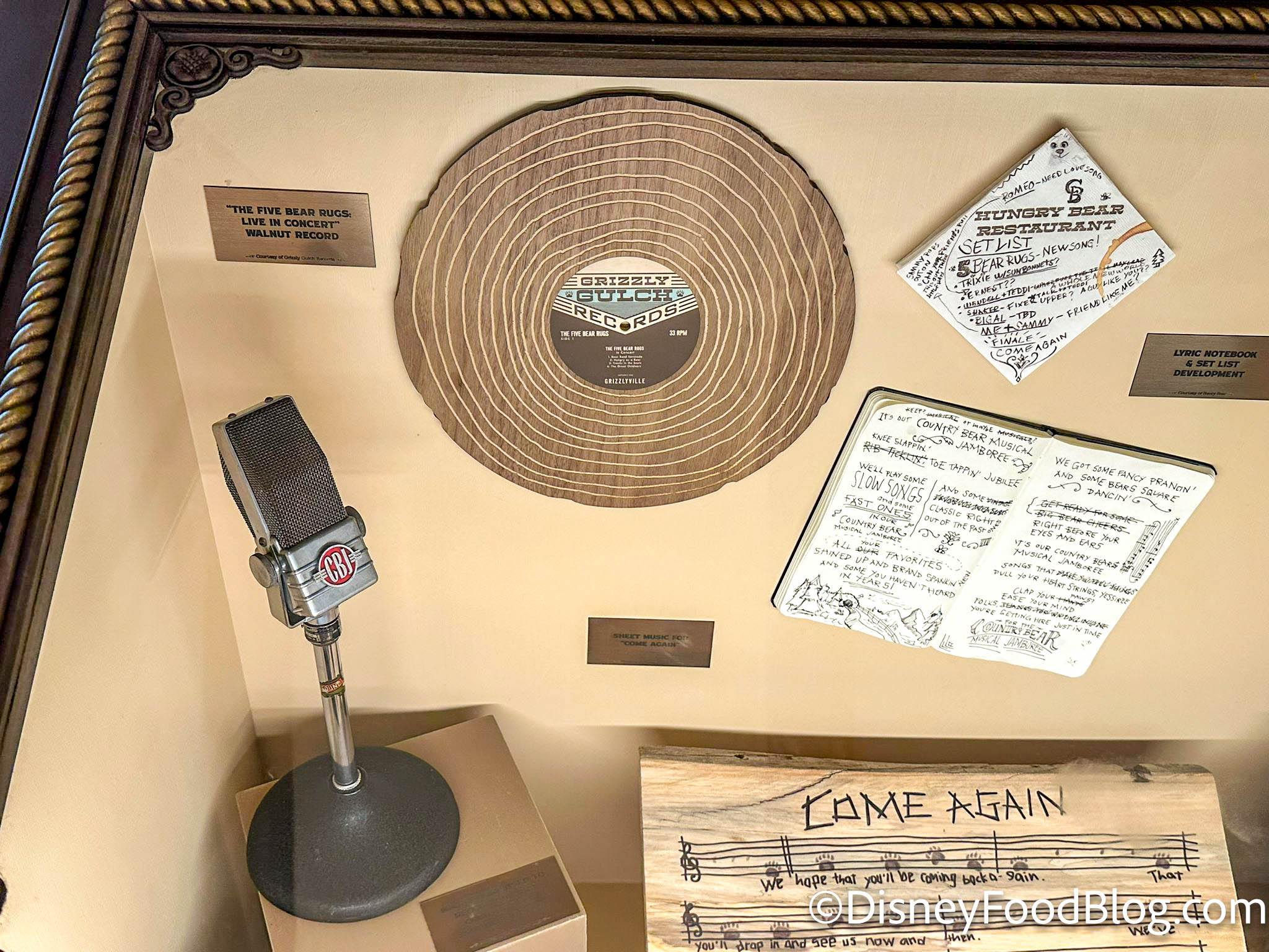 …and this “bear-scratch” sheet music for the original show’s finale song “Come Again.” There’s also a “pawwritten” setlist scrawled on a napkin from the Hungry Bear Restaurant at Disneyland.