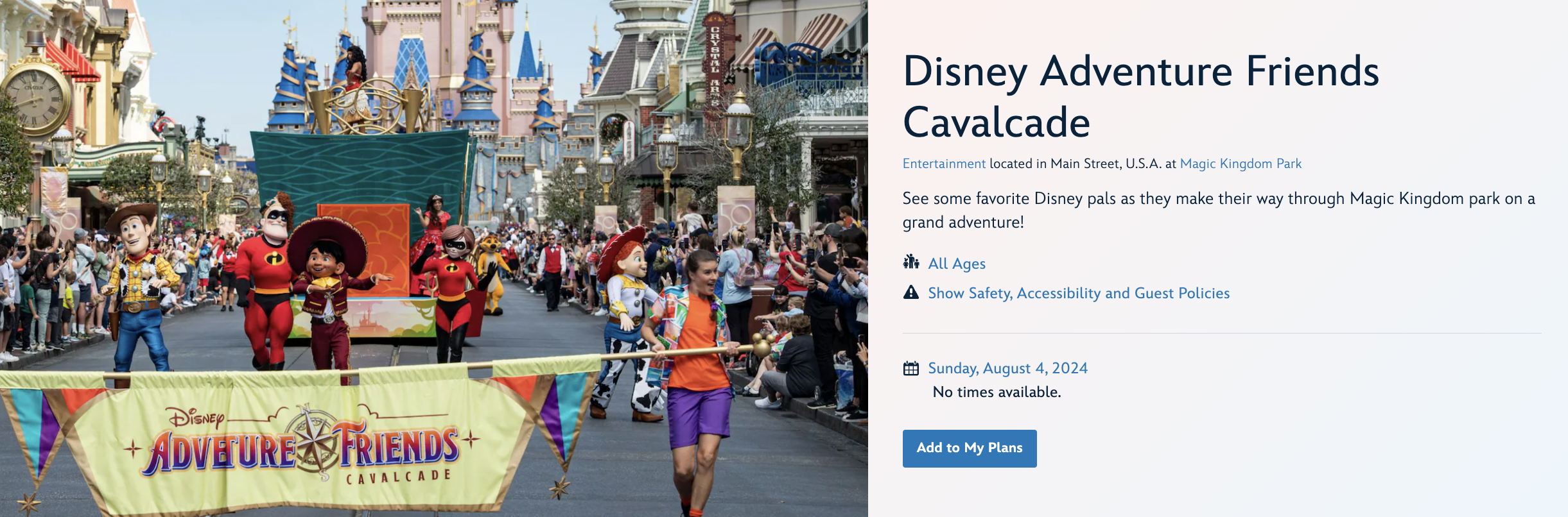 We were taking a look at the Disney World website pages for some popular entertainment options when we noticed that they just seemed to drop off the schedule entirely! Starting August 4th, both the Disney Adventure Friends Calvacade and the Festival of Fantasy Parade show no hours for Magic Kingdom.