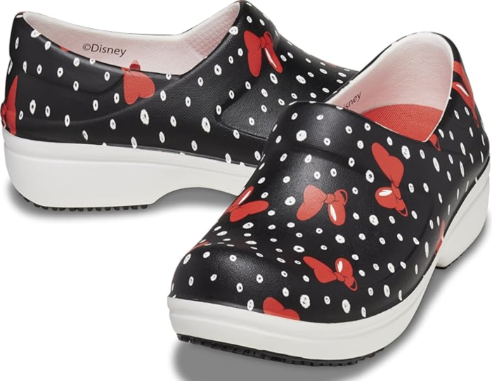 These aren’t your average Croc Clogs — these are the Minnie Mouse Neria Pro Clogs! They don’t have holes like the typical Croc-style shoe does. These are meant to be super comfy to wear all day long; they were actually designed to be used by people who work in food service, hospitality, and healthcare because folks in those fields tend to be on their feet all the time. That means they should be great to wear to the Disney World parks!