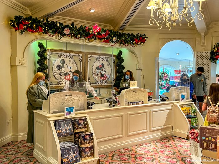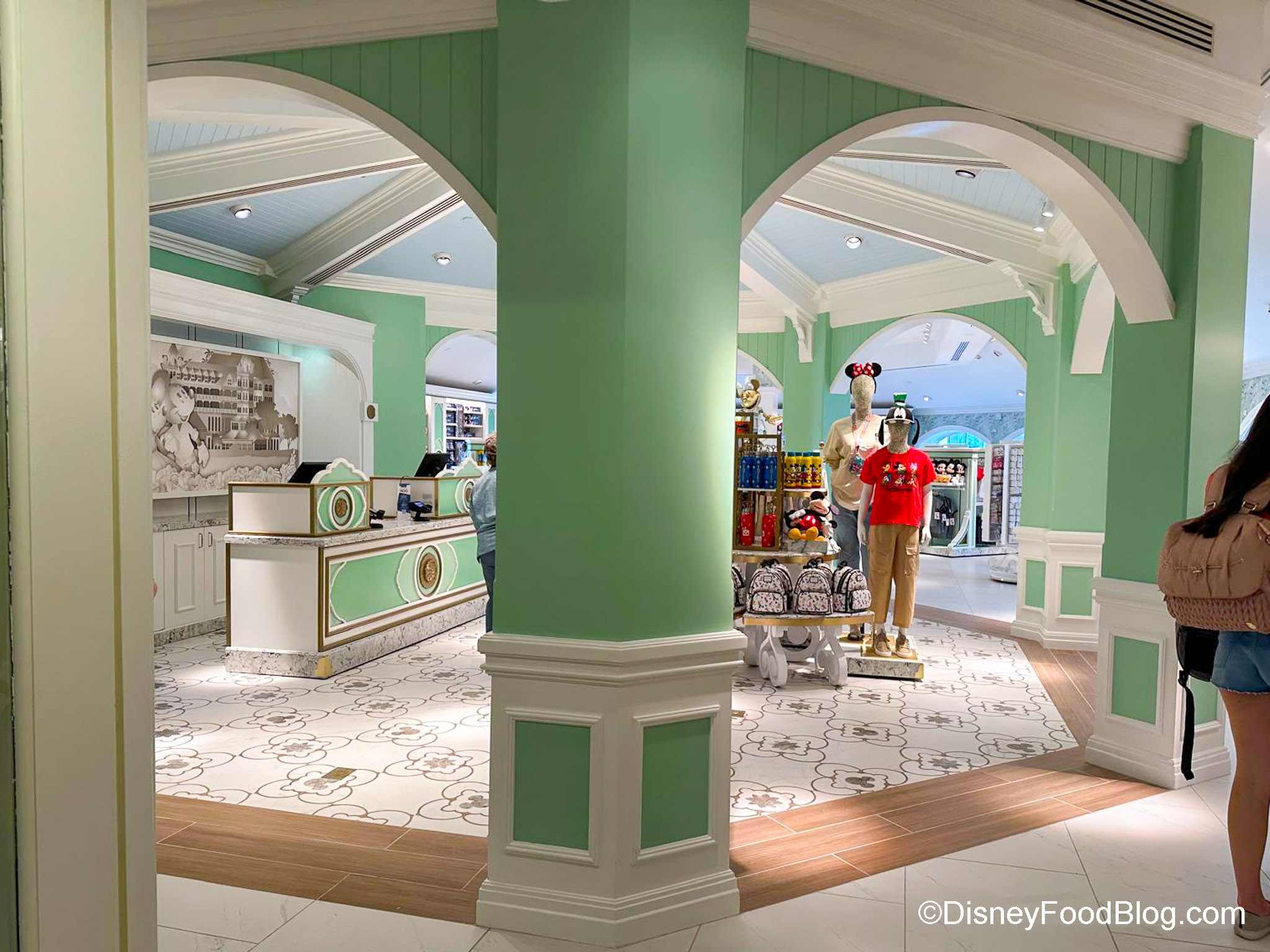 Here’s what it looks like now. That mint green color has been carried throughout the shop. There’s also new artwork behind the cashiers, featuring Mickey and Minnie in front of the Grand Floridian — so pretty! The entire area has been refined and cleaned out a bit, so it doesn’t look as busy.