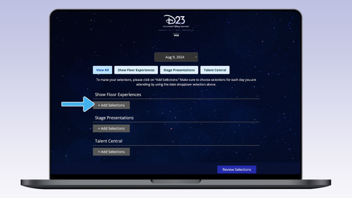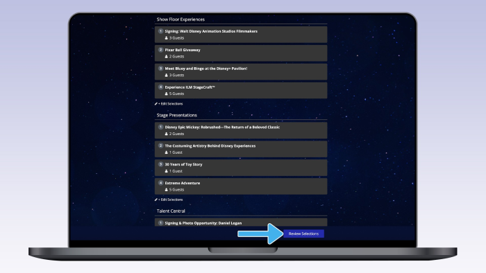 The Stage Presentations category will include reservations for sessions at Premiere Stage presented by Fandango, The Walt Disney Archives Stage, Backlot Stage, and Hyperion Stage. Talent Central includes reservations for talent photos and signings at Talent Central, and Show Floor Experiences provides reservations for experiences happening in booths around the Show Floor. Within each category, you can select up to four events and choose to bring up to seven guests with you for each selection. An important note is that the Reservation RSP is NOT for evening shows at the Honda Center. These presentations are for D23 Ultimate Fan Pass ticket holders only and there are no reservations OR stand-by queues available.