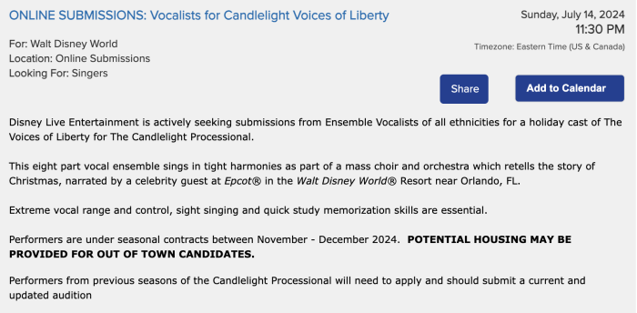 When we were checking out Disney’s latest audition notices, we spotted an audition call for “Vocalists for Candlelight Voices of Liberty.” Disney is looking for ensemble vocalists for a holiday cast of the Voice of Liberty for the Candlelight Processional. This reaffirms that the Candlelight Processional will return to EPCOT this year for the EPCOT Festival of the Holidays. YAY!