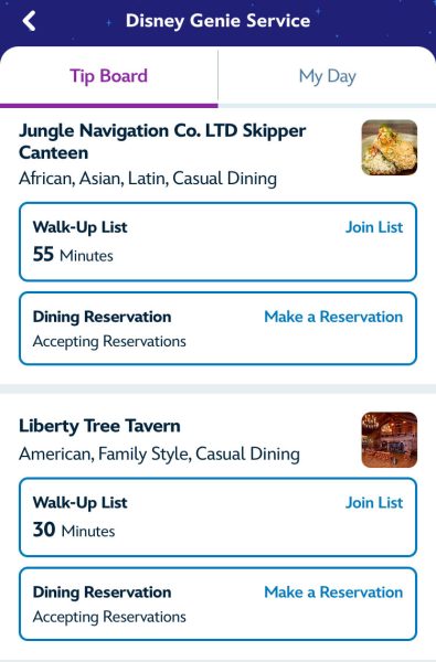 These include — but aren’t limited to — the Mobile Dine Walk-Up Waitlist option where you can see the current walk-up wait times for table service restaurants and lounges, just like you would be able to for a ride!