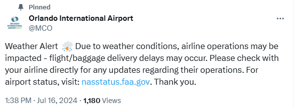 The ground stop is currently set to expire at 2:30PM ET, but the message states that there is a high probability (greater than 60%) that the ground stop will be extended even further. The Orlando International Airport also posted a message on X/Twitter warning of a weather alert. The message stated that due to weather conditions, airline operations may be impacted.