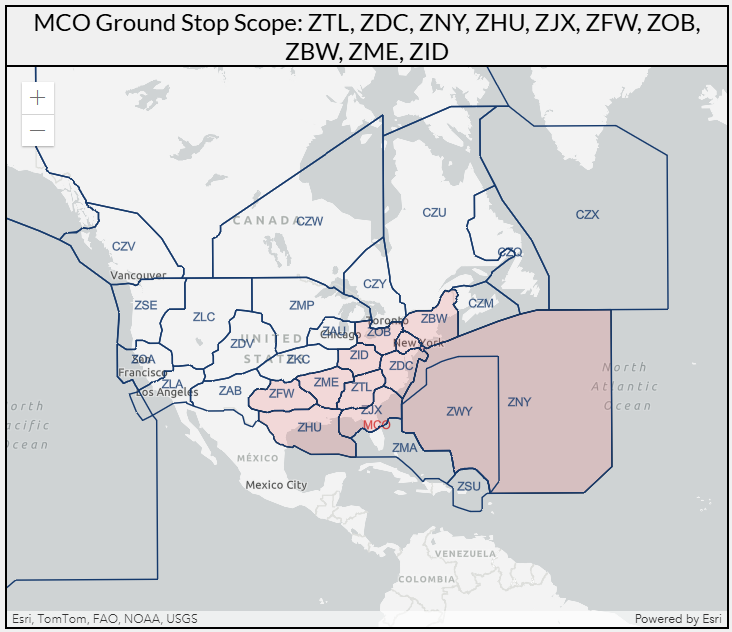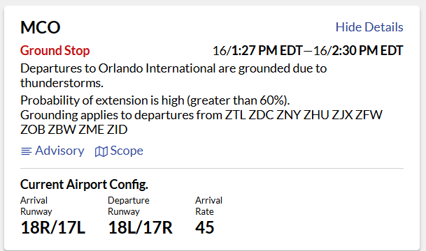 Orlando International Airport is currently under a ground stop until 2:30PM ET (with a high probability of extension) due to thunderstorms. This ground stop affects departures to Orlando International Airport from certain areas of the country.