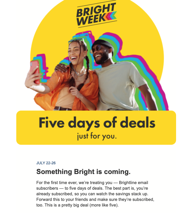 Beginning July 22nd through July 26th, 2024, Brightline will host Bright Week — a five-day promotion offering some of its best deals.