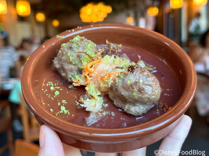 They’re rolled into a meatball consistency, and when you bite into them, it’s like a flavor explosion in your mouth. They’re lightly coated in something sweet like a teriyaki sauce, and we found these to be a delicious tease of the turkey and chicken meat, coupled with the sweet cranberry preserve. Still, we almost missed the crispy sauerkraut unless we were really looking for it underneath the other more prominent flavors.