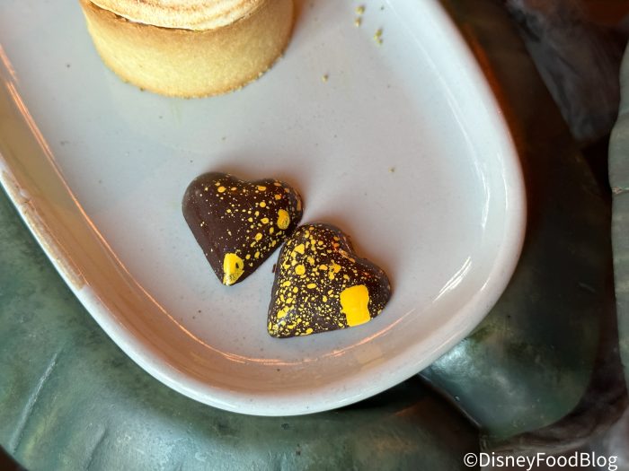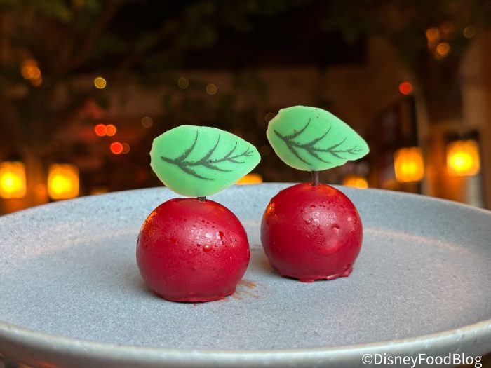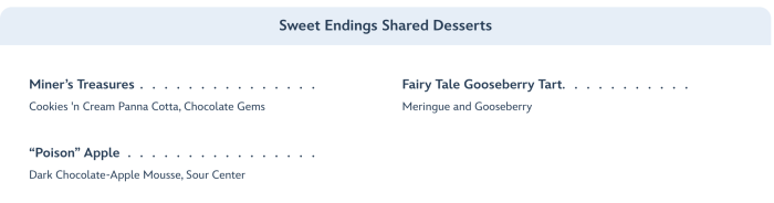 Dessert is another multi-sampling option, just like the shared appetizers. Here, we were treated to Miner’s Treasures, Poison Apple, and Gooseberry Pie. But there was also a special chocolate treat that was brought out to our table resembling a chocolate heart served on dry ice that billowed out of the Queen’s box she’d gifted the huntsman for Snow White.