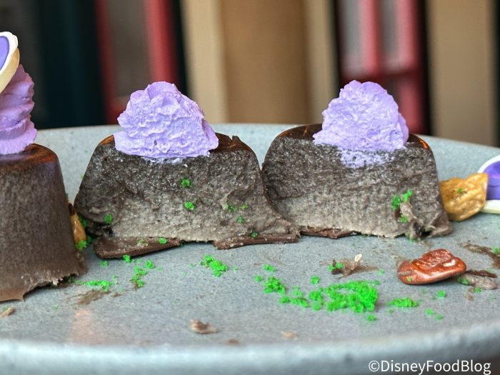 It tastes like cookies and cream whipped mousse inside and held together surprisingly well! The rock pieces taste like bits of brownie at first, but once you chomp down, you get a milk chocolatey taste, kind of like an M&M candy piece. If you’ve ever tried the Grey Stuff at Be Our Guest, this was very similar.