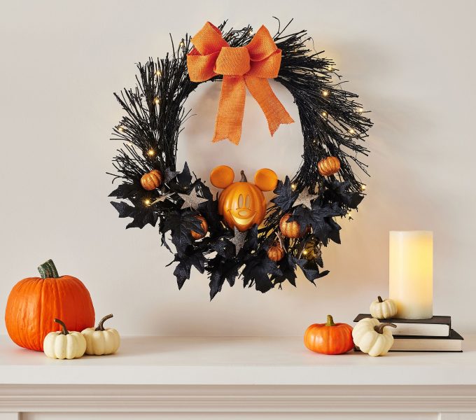Want a Mickey pumpkin wreath that’s all your own? Grab this wreath which features a cute Mickey pumpkin in the center, as well as little pumpkins throughout. It also lights up!