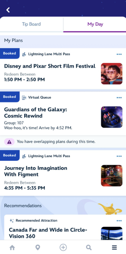 But then, there are also Virtual Queues for more popular rides. With these rides, you still have a window of time you need to return to the attraction in order to ride. Disney has been lax with these return times sometimes in the past (aside from at TRON), but the My Disney Experience app has always shown the hour return window.