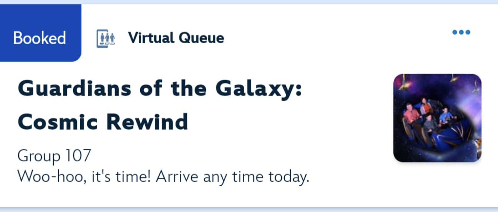 Now, though, it seems like that has changed! When one of our team members booked a Virtual Queue for Guardians of the Galaxy: Cosmic Rewind, the app notified them that it was time to ride, and there was a message that said they could return anytime during the day to ride — not just during their window!