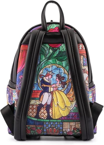 This may be our favorite Loungefly of all time. Along with 3D-layered appliqué, there’s a gorgeous Beauty and the Best stained glass design that wraps around to the back…